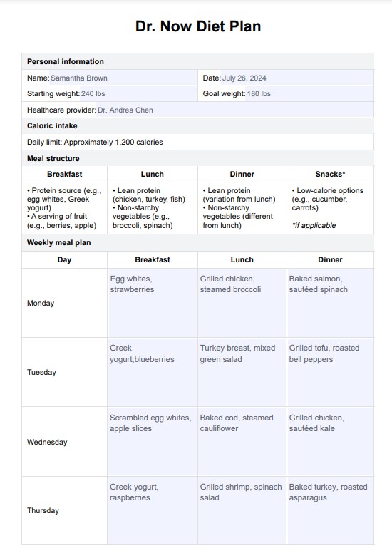 The Dr. Now Diet Plan is a low-calorie, high-protein diet designed primarily for extreme weight loss, especially in obese individuals preparing for bariatric surgery. It typically restricts daily caloric intake to around 1,200 calories.