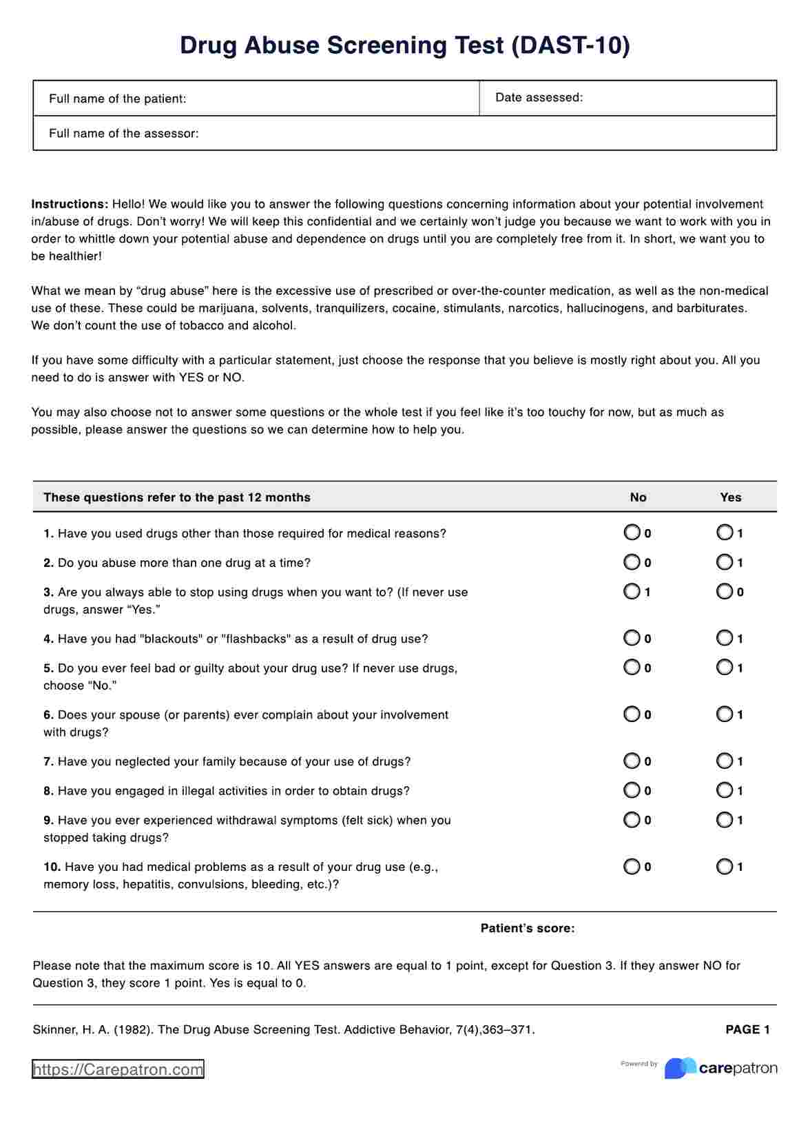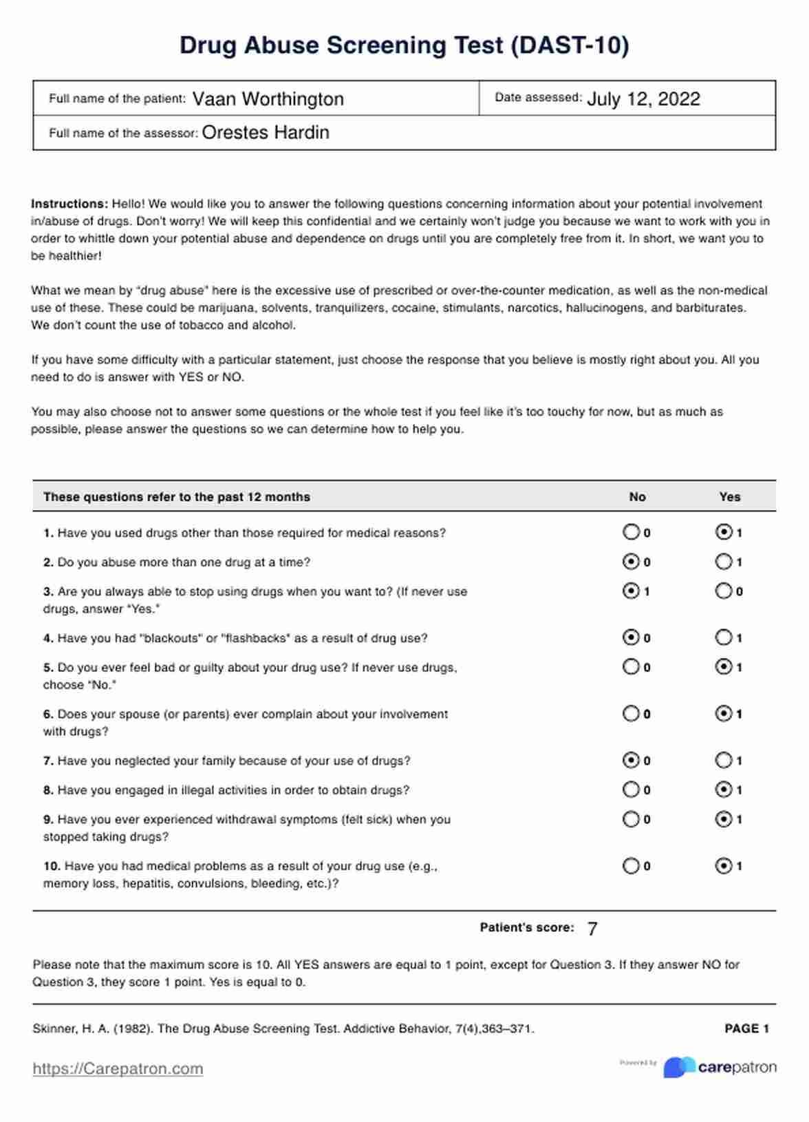 No. The DAST-10 Test is a screening tool, not a diagnostic tool. It is used to help you determine what courses of action you should take when it comes to the patient you are evaluating. Did their score fall under the substantial or severe level Then they require more comprehensive examinations for a diagnosis, and a corresponding treatment plan can be made.