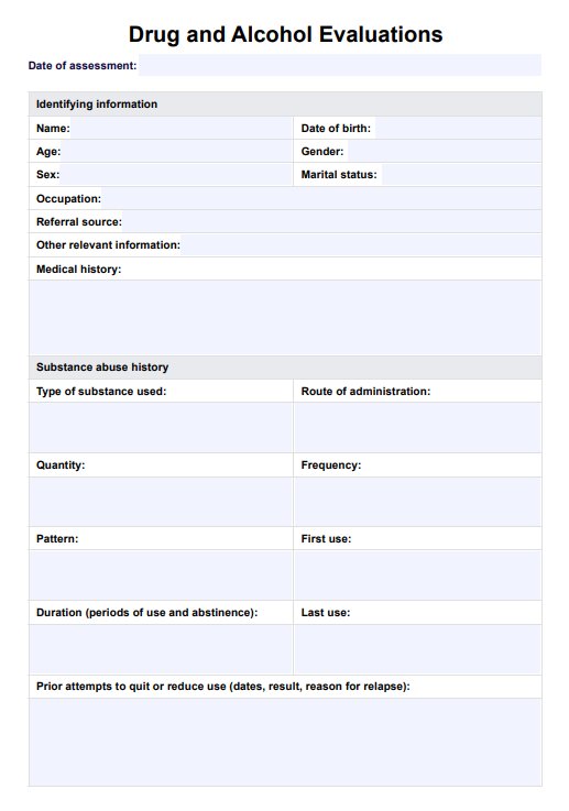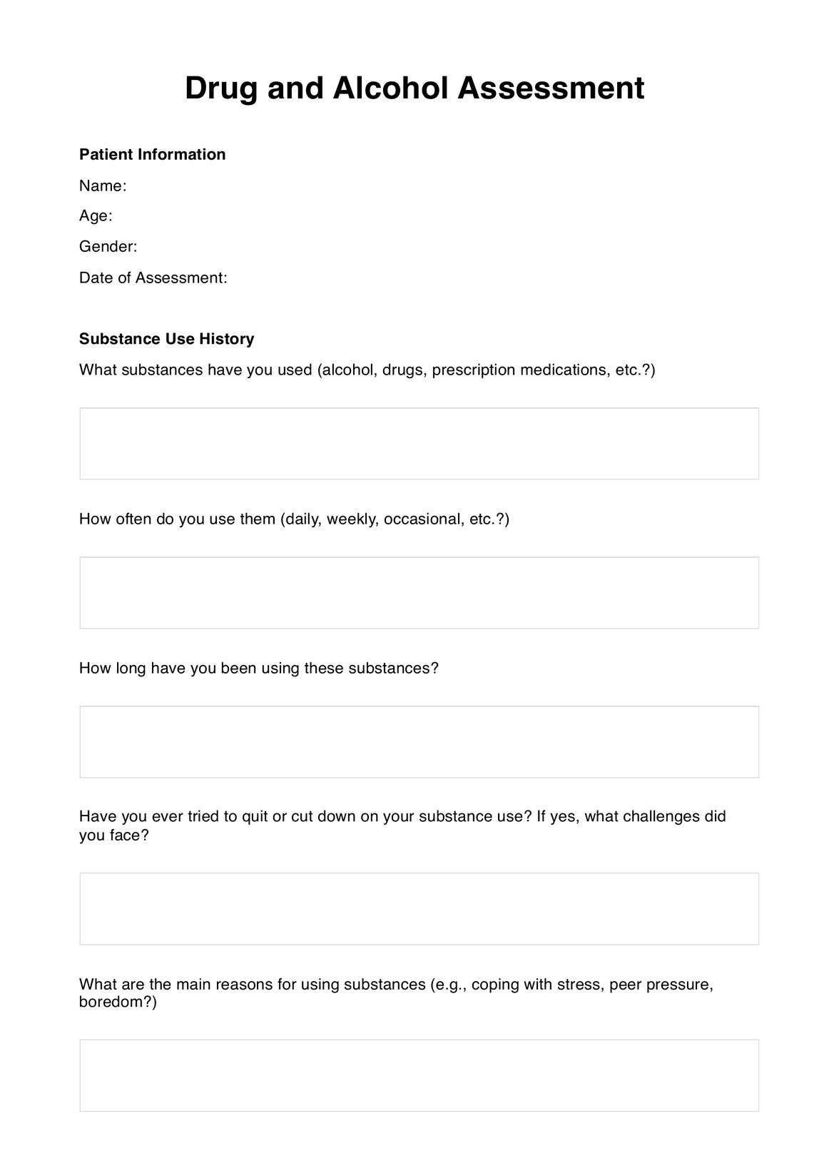 The Drug and Alcohol Assessment is used by healthcare providers, mental health professionals, and addiction treatment providers as a screening tool to assess severity and develop treatment plans for substance use disorders. Additionally, courts may order these assessments as part of probation or parole agreements, and employers may use them in pre-employment screening processes.