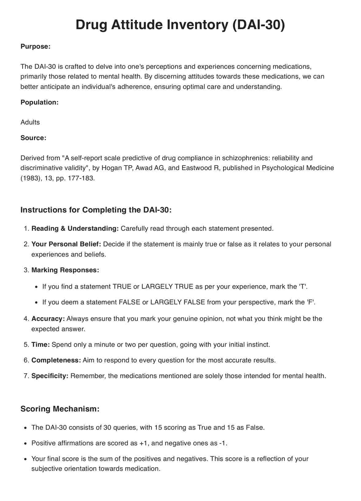 Use the Drug Attitude Inventory (DAI-30) to evaluate patient sentiments on medications, fostering improved understanding and compliance. Learn more with Carepatron.
