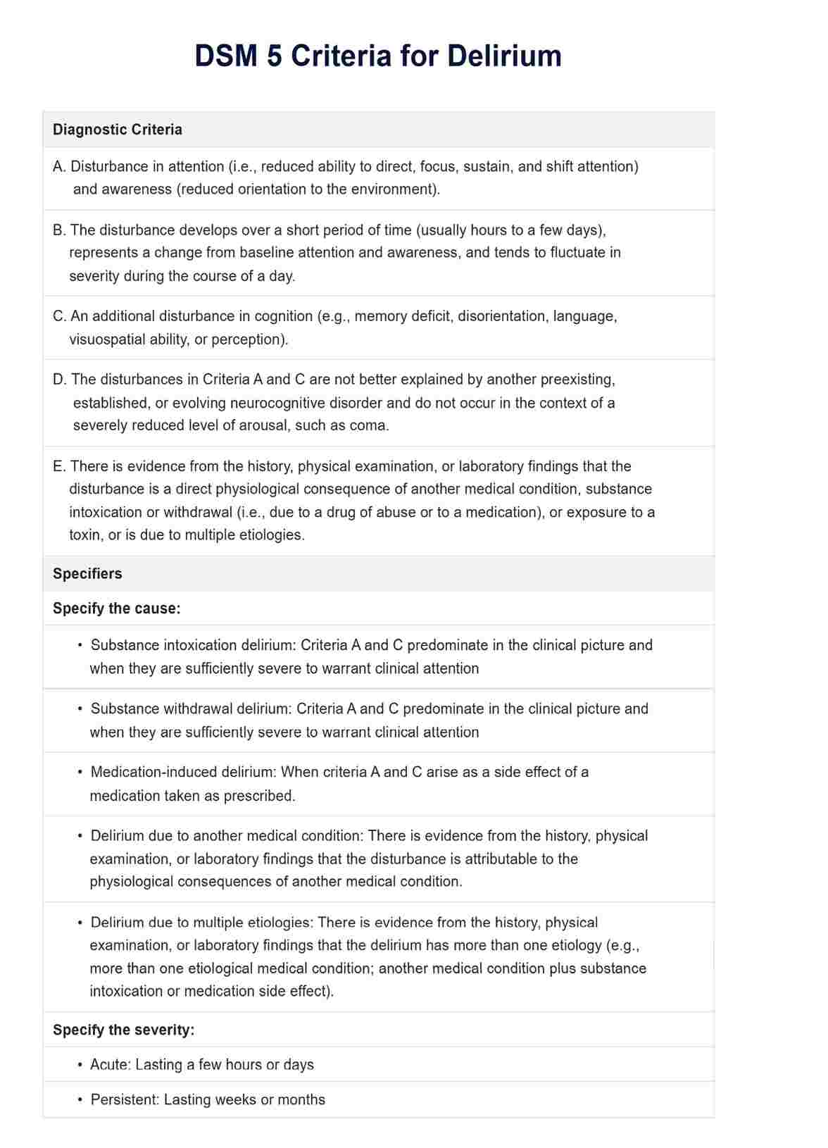 Discover the DSM 5 Criteria for Delirium with our free template. Ideal for mental health professionals seeking a quick reference guide for patient care.