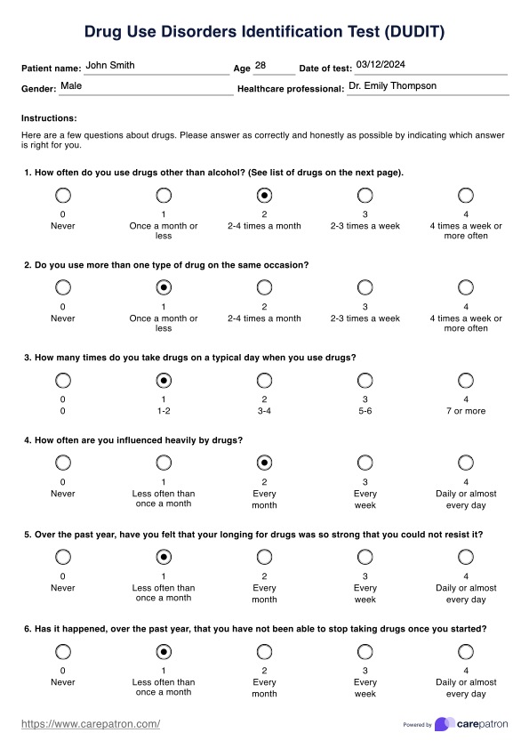 Use the Drug Use Disorders Identification Test (DUDIT) to help assess drug use and identify potential concerns in clients. Download this for free!