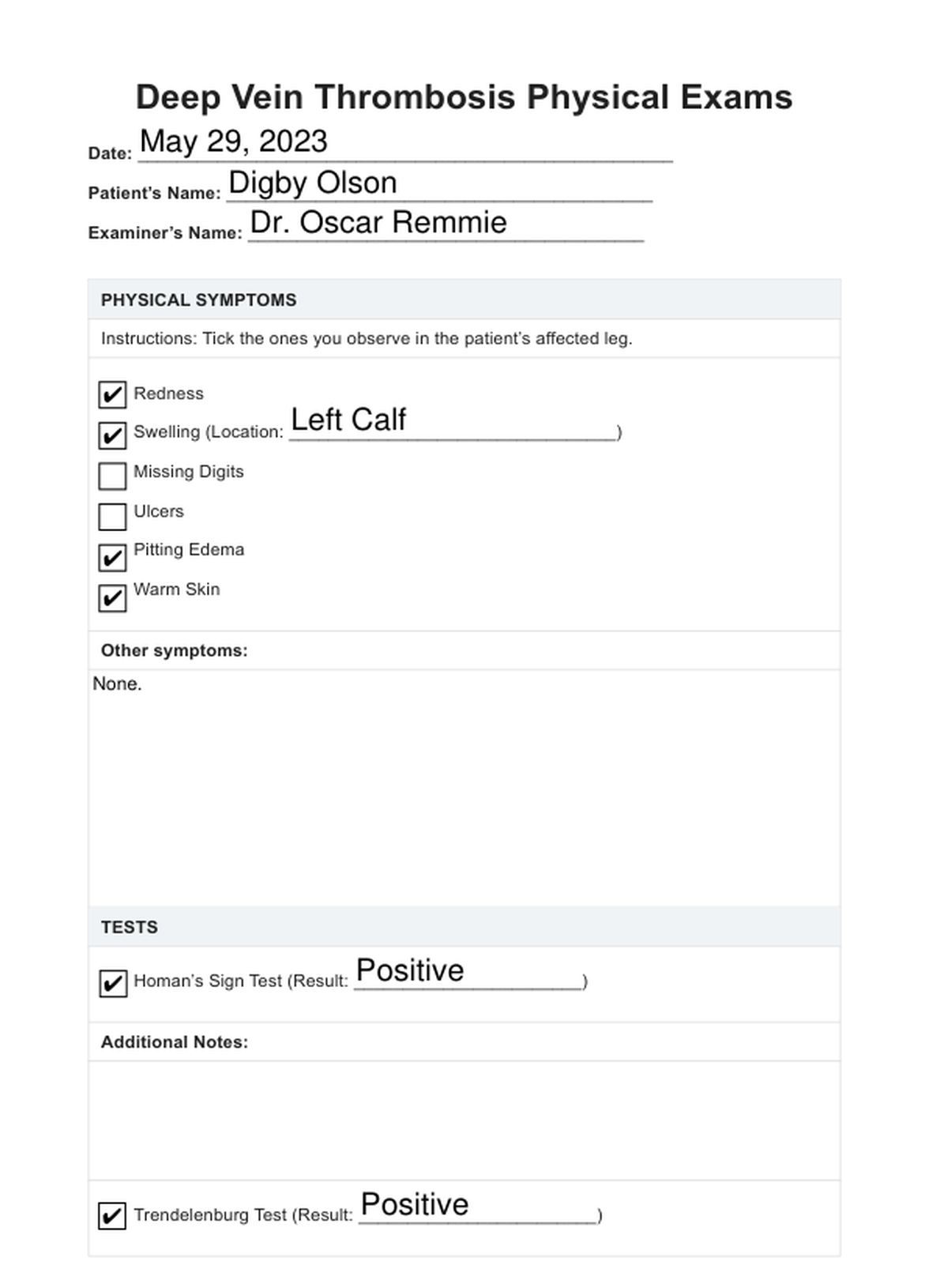 Here’s a compilation of DVT physical exams you can conduct on your patient to assess if they have deep vein thrombosis. Click here for a guide and a copy of our free template.
