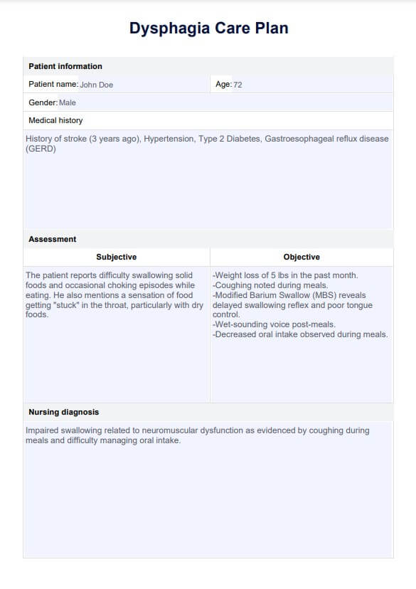 Optimize patient outcomes with our free Dysphagia Care Plan template. Streamline care delivery for individuals with swallowing difficulties.