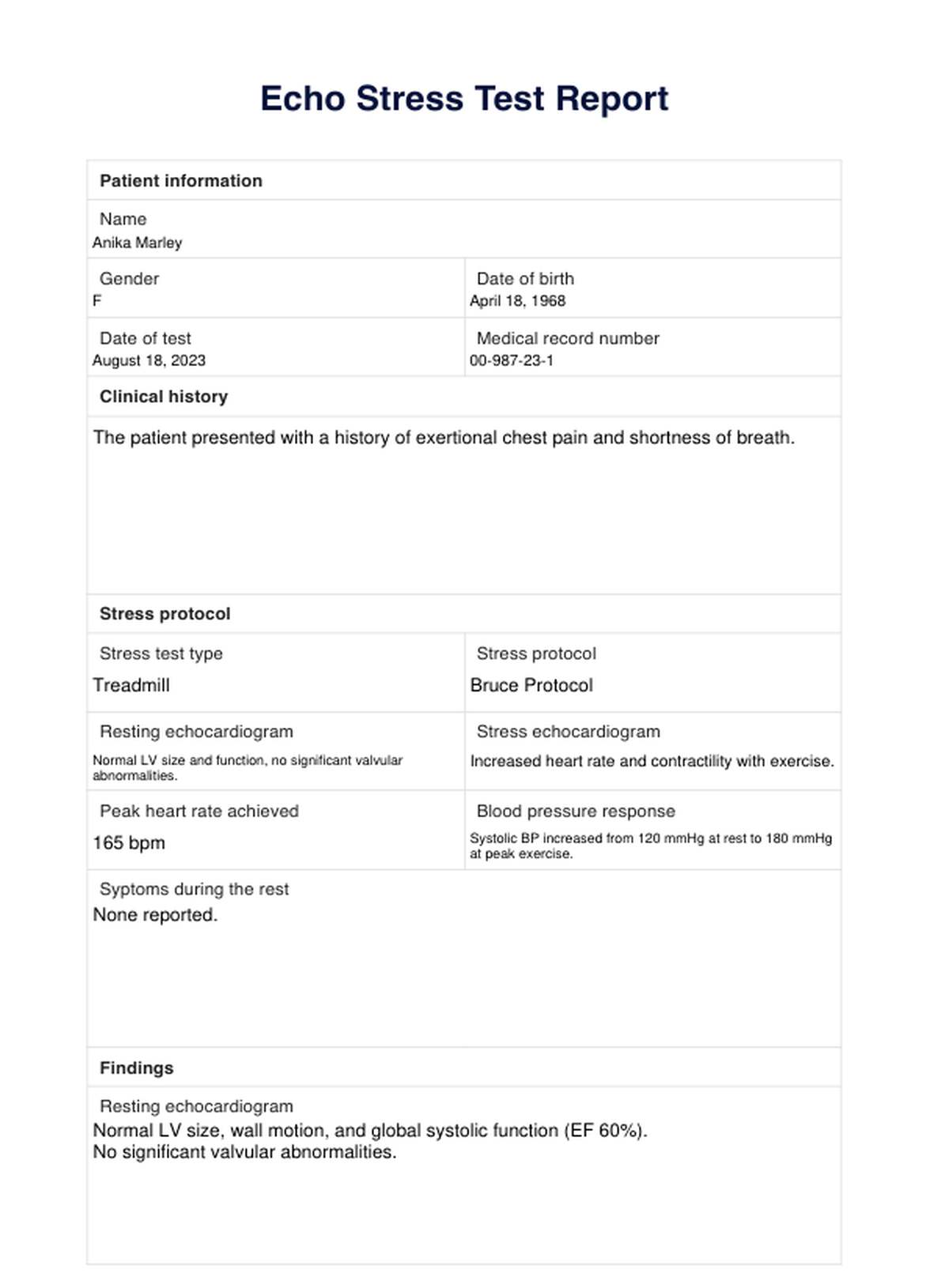 Get access to a free Echo Stress Test Report template. Document your patient results with Carepatron's user-friendly PDF template.