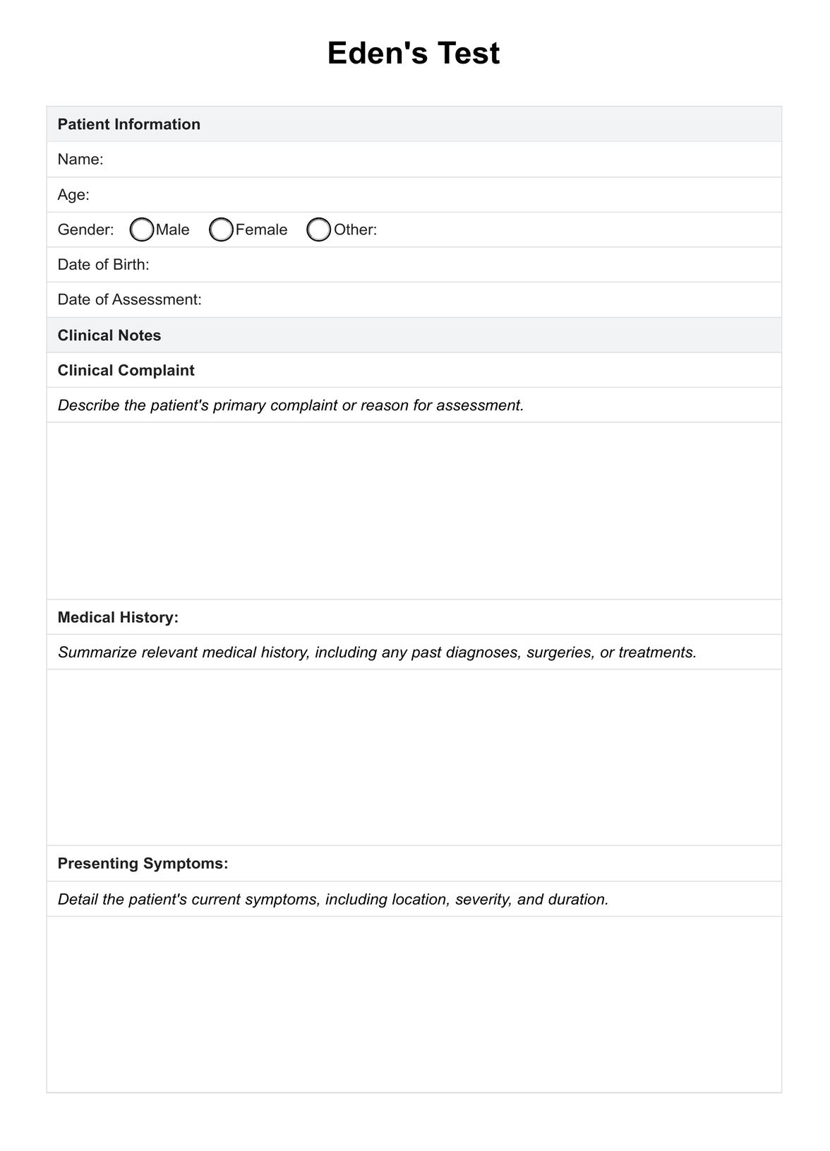 To perform the Eden's Test, the patient is instructed to retract their shoulders and bring their shoulder blades together, mimicking the military position. The h