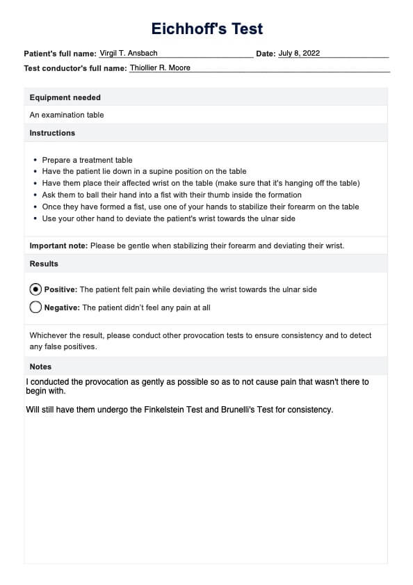 Perform the Eichhoff's Test to detect the possibility of De Quervain's tenosynovitis in patients.