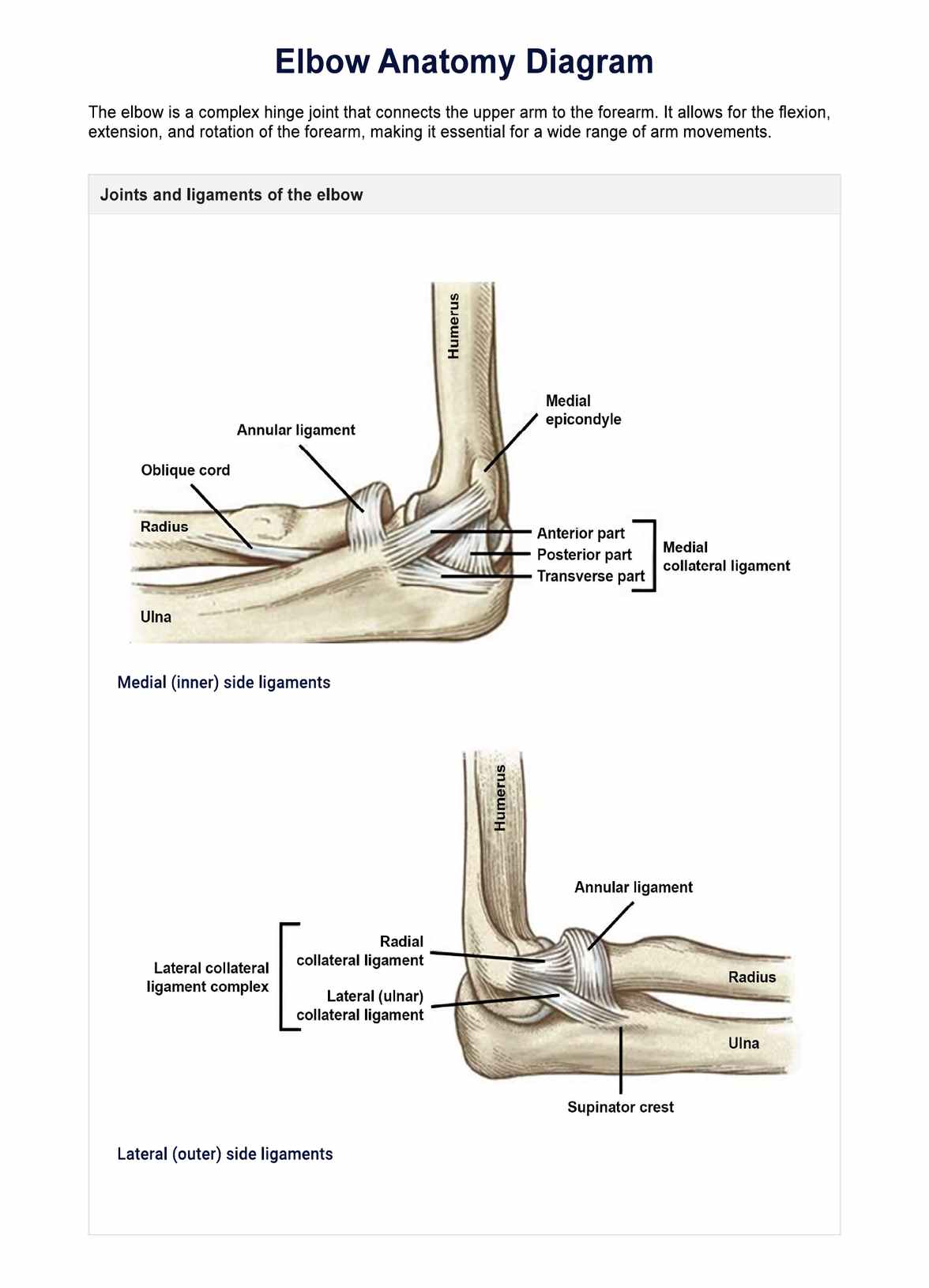 Explore our Elbow Anatomy Diagram, a valuable resource for healthcare professionals and students, with labeled bone and ligament images. Download now!