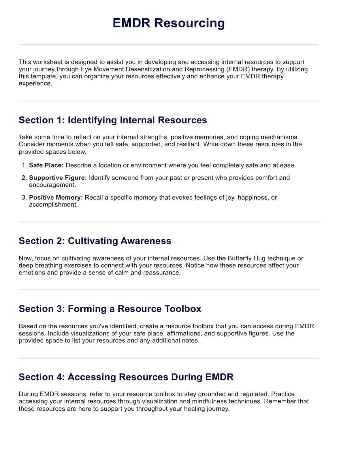 Download Carepatron's free PDF with examples of EMDR resourcing techniques. Explore different ways to support your clients with effective resourcing strategies.
