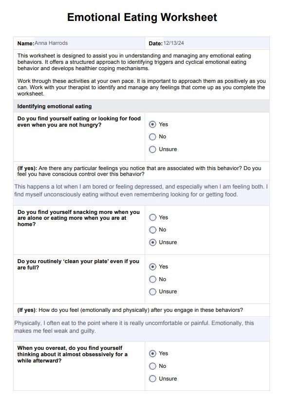 Emotional Eating Worksheets are tools used by mental health professionals to help individuals understand and manage their emotional eating behaviors (which are often symptoms of eating disorders). These worksheets encourage self-reflection about the triggers, effects ,and feelings of emotional eating. This facilitates the development of strategies to cope with emotional hunger and reduce reliance on food for emotional comfort.