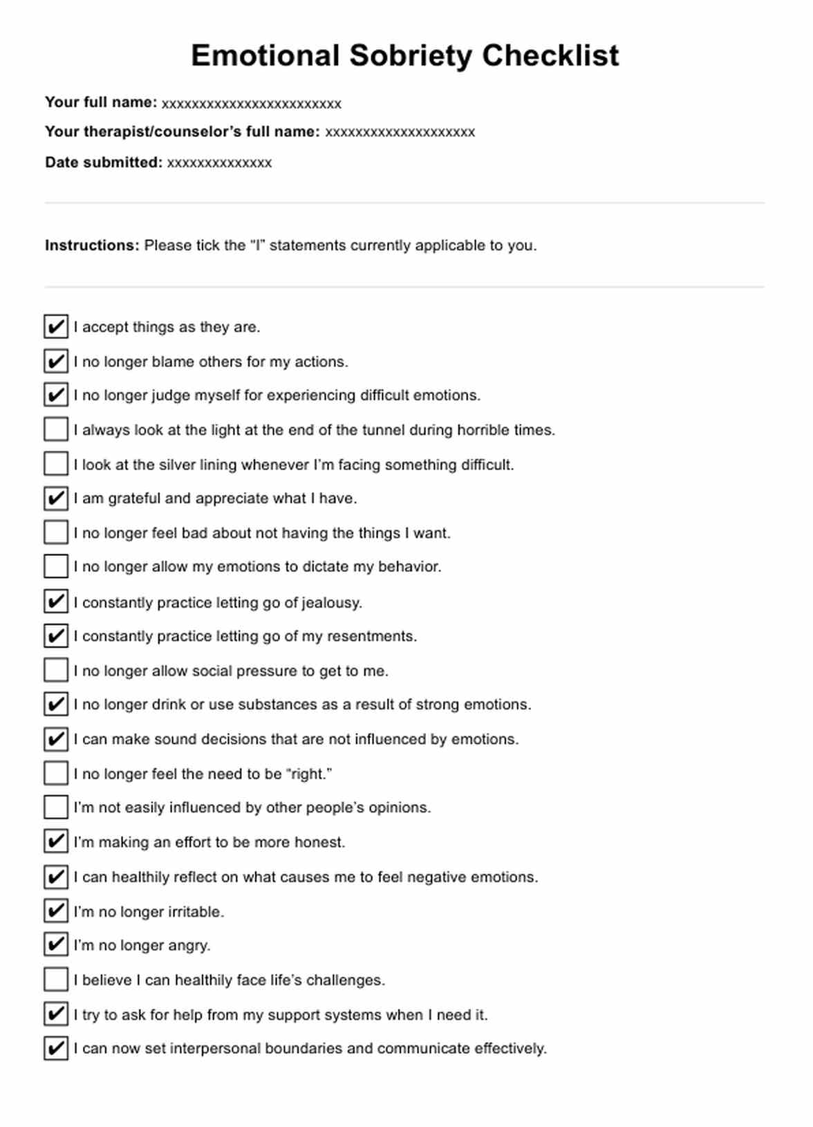You simply look at what’s been ticked and what hasn’t been ticked. The statements that haven’t been ticked are things you might want to look into as you go through your therapy or counseling program. This checklist has no scoring and designations. It’s meant to show you where your patient is regarding their emotional sobriety.