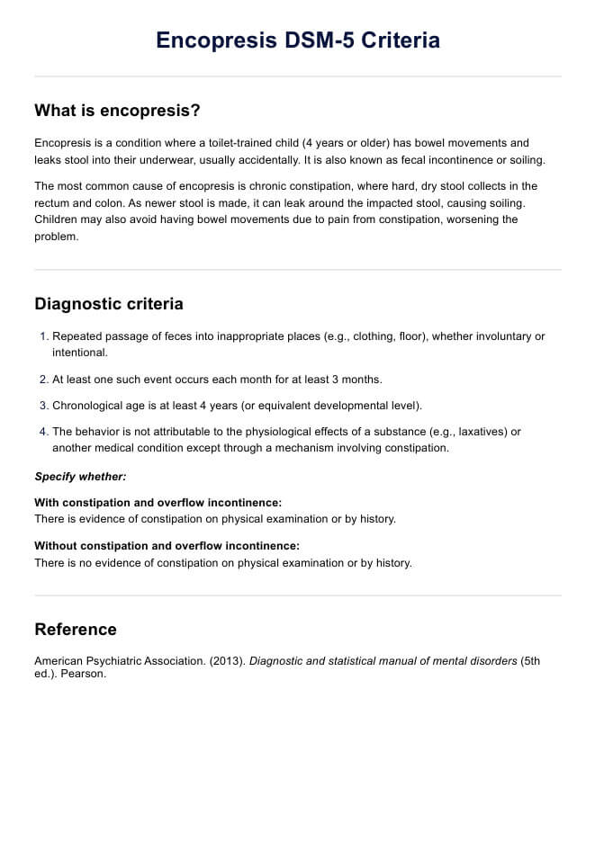 Download our Encopresis DSM-5 Criteria as a reference tool when working with clients who present symptoms of elimination disorders.