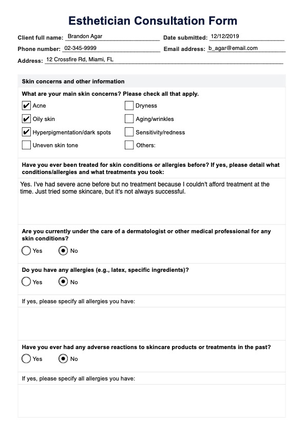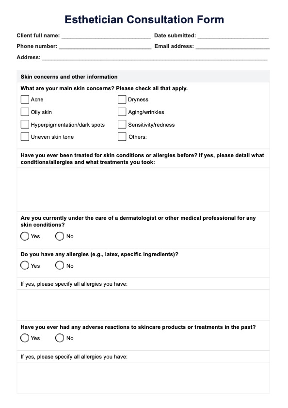 Download a free Esthetician Consultation Form template for comprehensive skin assessments. Get our free PDF template and example now.