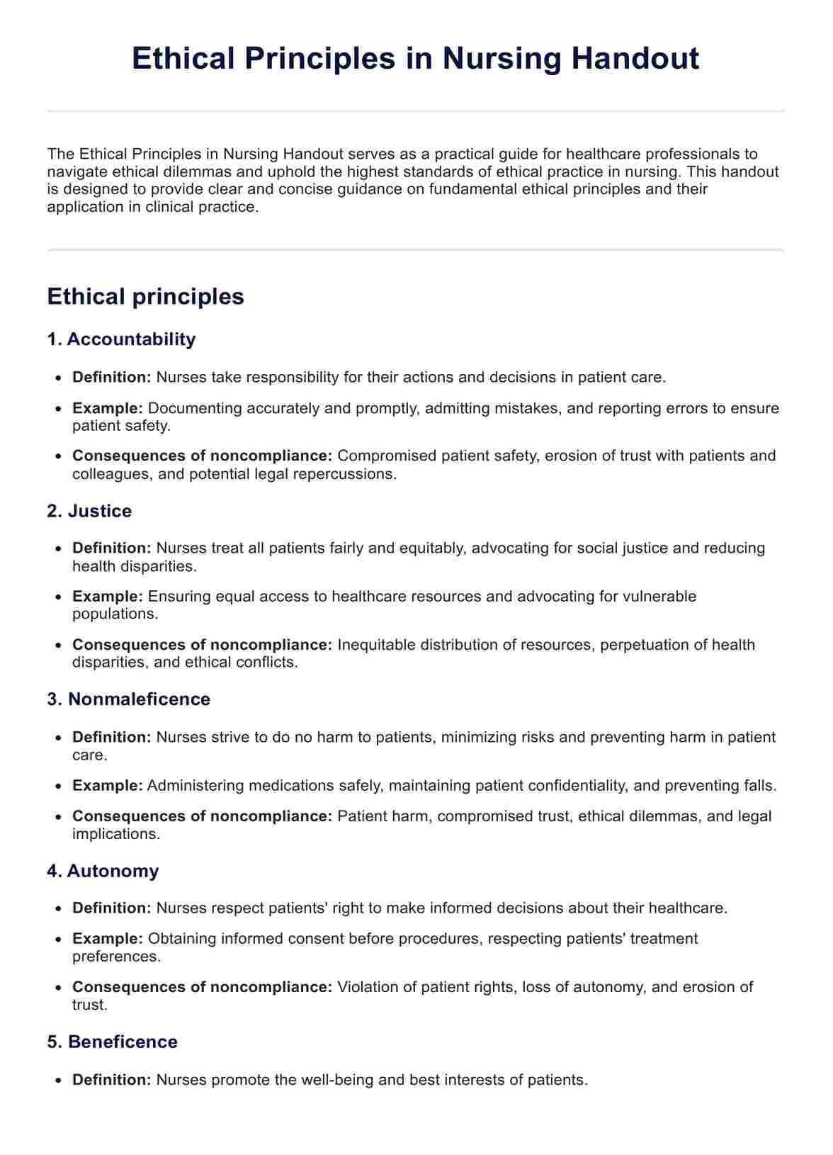 Download Carepatron's free PDF handout on Ethical Principles in Nursing, along with examples to help nurses navigate moral dilemmas in healthcare settings.