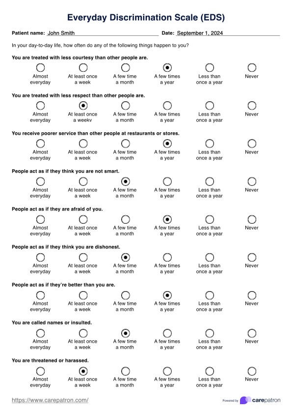 Learn about the Everyday Discrimination Scale (EDS) and see an example. Download Carepatron's free PDF to use this tool for measuring perceived everyday discrimination.