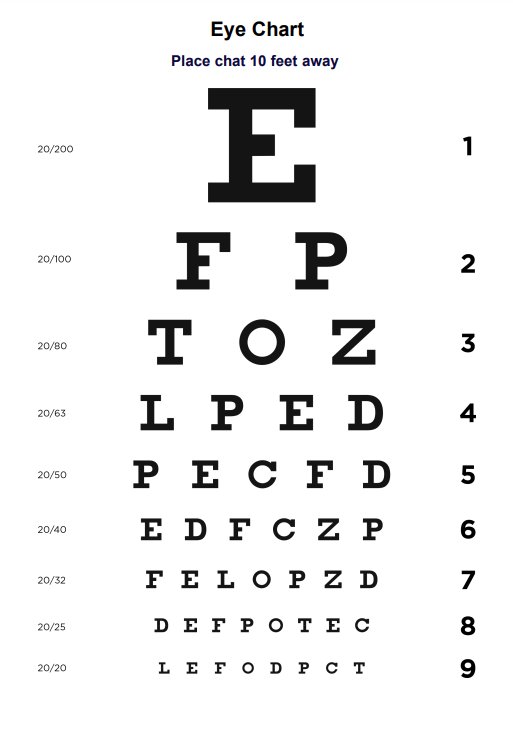 The eye chart is scored based on the smallest row of letters that the test taker can read accurately. This is expressed as a fraction, such as 20/20, 20/40, etc. The numerator represents the distance from the chart (20 feet), and the denominator represents the distance a person with "normal" vision could read the same line.