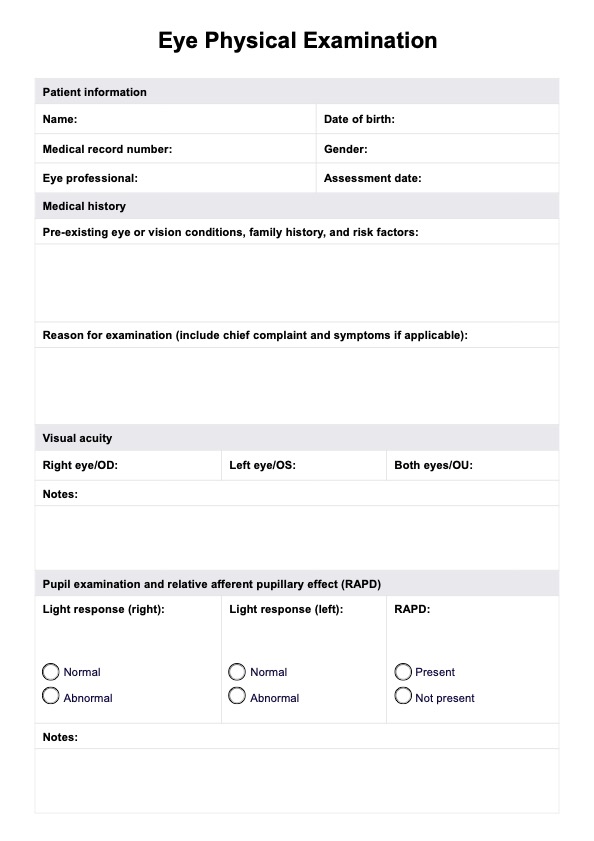 An eye physical exam assesses vision and eye health and detects any abnormalities or diseases. Download Carepatron's free eye exam PDF here.