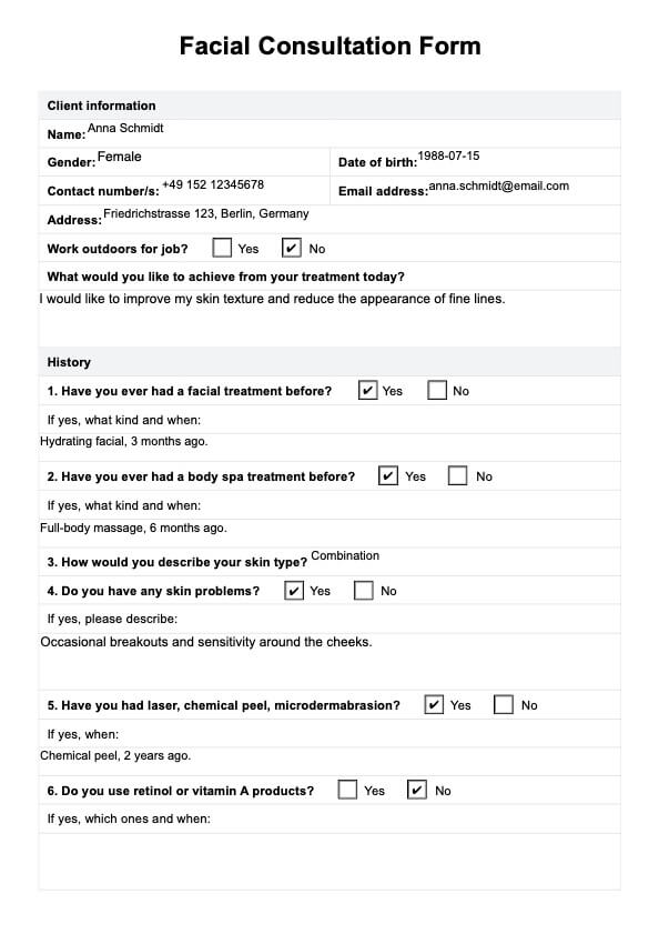 Obtain information on the patient's skin history and reason for visiting by giving them a facial consultation form. Get the template for free!