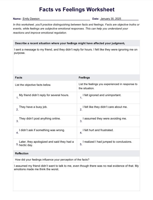 Promote emotional regulation and logical thinking with our Facts vs Feelings Worksheet. Help clients differentiate between facts and feelings in therapy sessions.