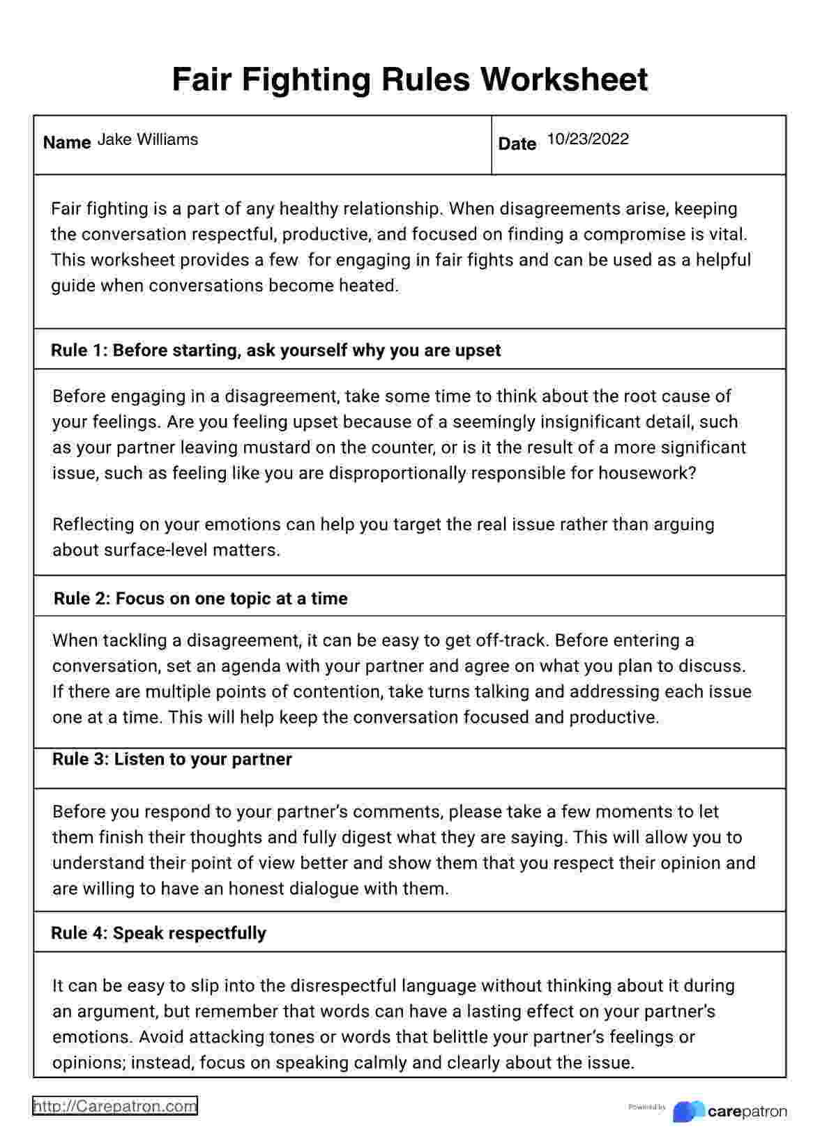 Psychologists and other mental health professionals use a fair fighting rules worksheet to help couples learn how to resolve conflicts effectively. It thoroughly explains the main guidelines of fair fighting, which can help couples communicate more constructively.
