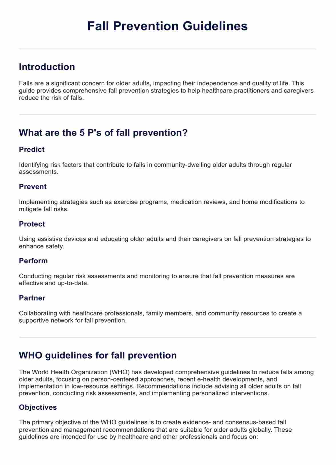 Download Carepatron's free Fall Prevention Guidelines PDF, with examples and tips to help prevent falls. Stay informed and protect yourself and your loved ones.