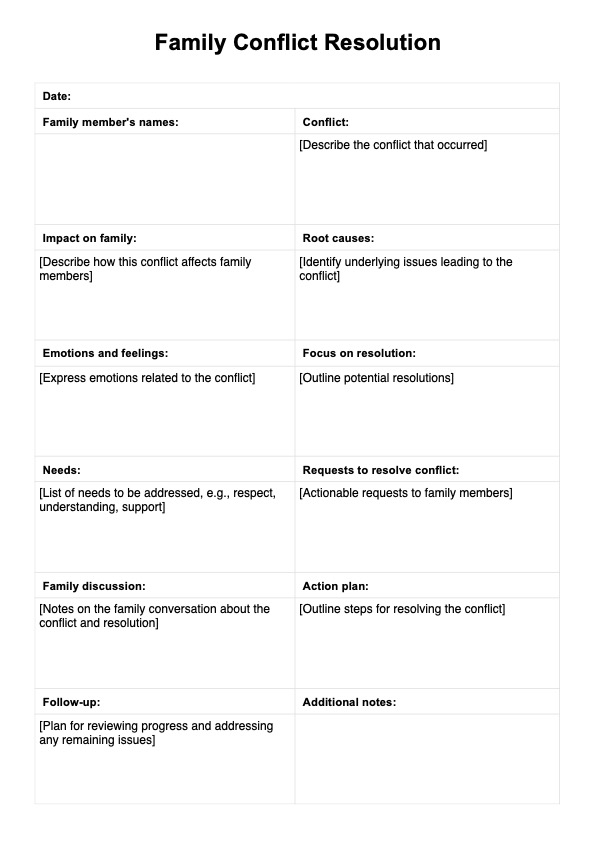 Family members who need to conduct family meetings to strengthen their bond or are looking for a way to navigate challenging times may use the templates. Practitioners caring for the aforementioned family can use a completed template when conducting family counseling or therapy sessions.