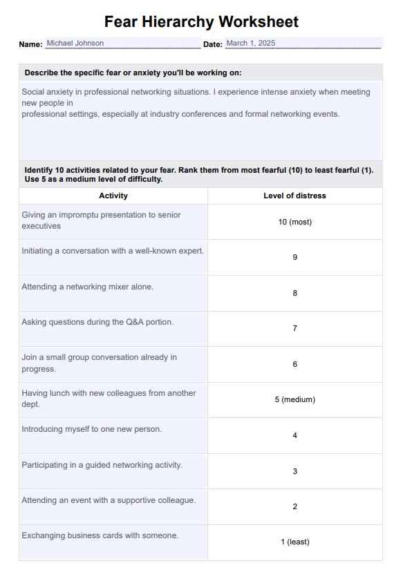 The time to complete the Fear Hierarchy Worksheet varies. Still, it typically takes individuals a few sessions to systematically list and address their fears, progressing from lower-level to more challenging ones.