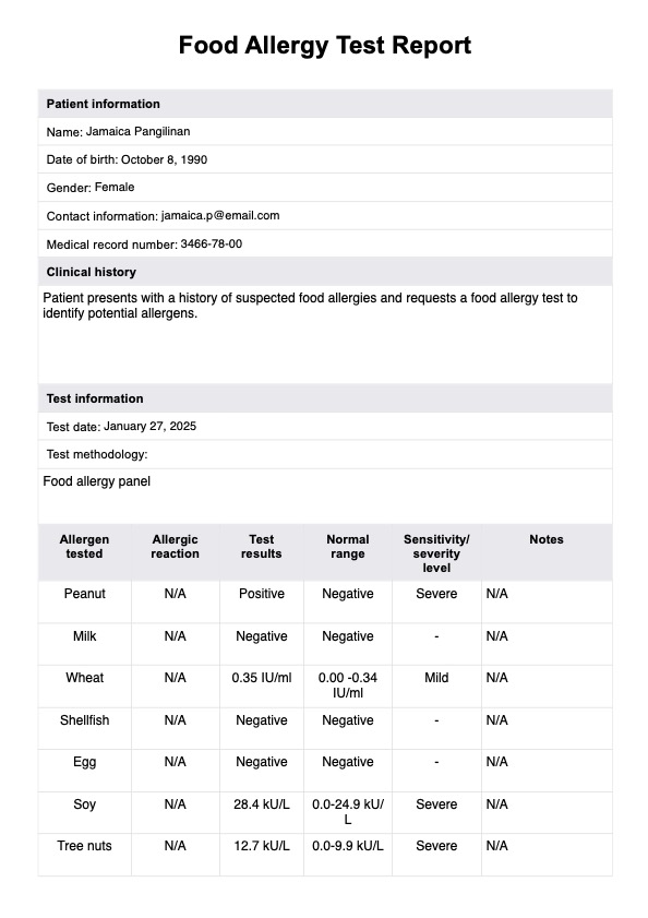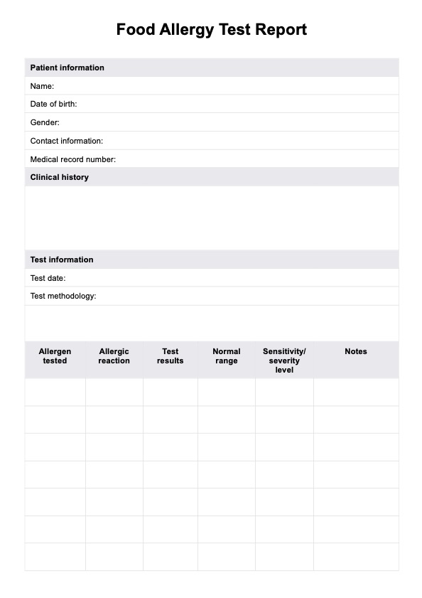 Food allergy tests help identify which foods trigger an allergic reaction. Download a Food Allergy Test Report to organize and record patient results.