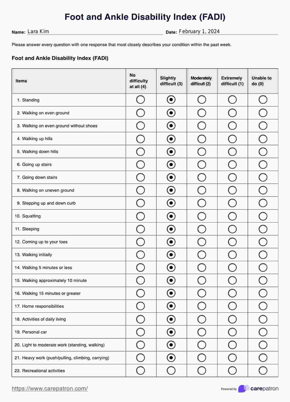 The Foot and Ankle Disability Index (FADI) is a standardized measurement tool used to assess the functional ability of individuals with foot and ankle disabilities. It consists of patient-assessed questionnaires that cover various aspects of daily activities and sports-related movements.