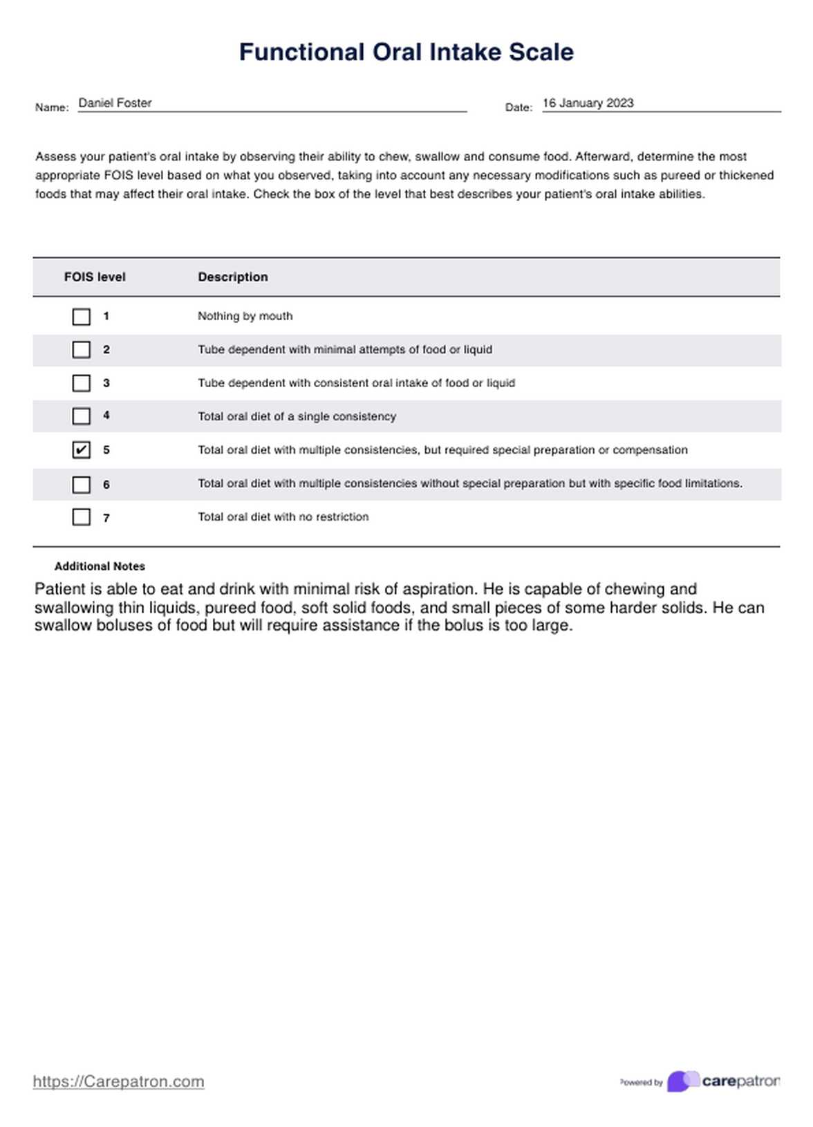 Measure your patient's oral intake capabilities with the Functional Oral Intake Scale. Download the free PDF template and example to get started.