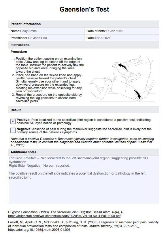 Evaluate your patient's sacroiliac joint function with the Gaenslen's Test. Access a free guide and instructions to perform this test accurately and effectively.