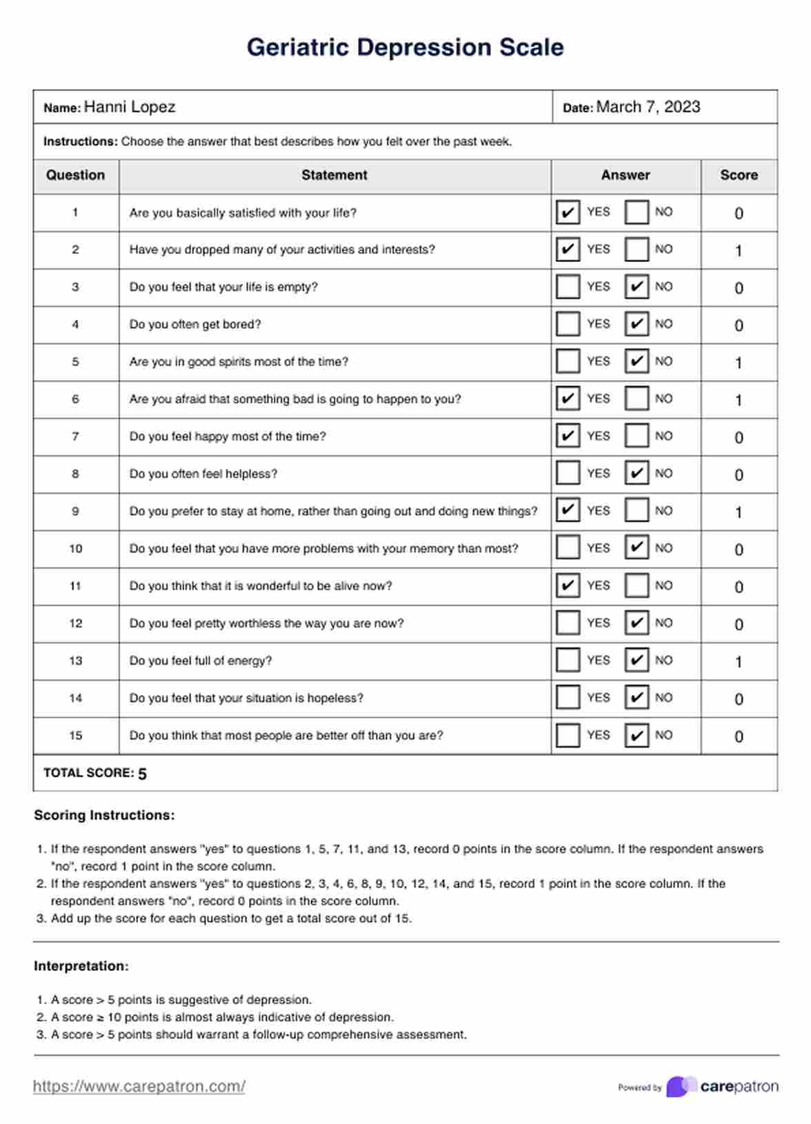 The reason why this scale will help you answer certain questions is that you can use their Yes or No answers for specific questions on the questionnaire to help frame your sessions with the geriatric patient. You can have them elaborate on their Yes or No answers.