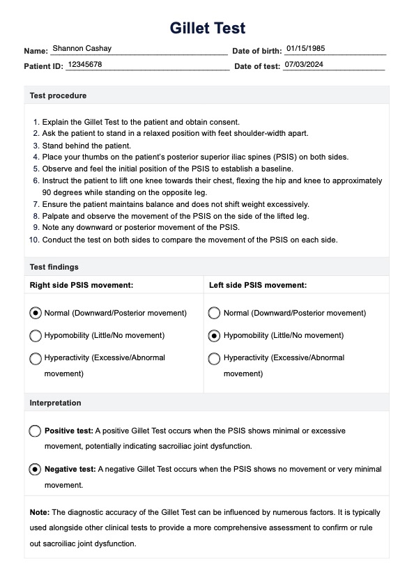 Learn about the Gillet Test for assessing sacroiliac joint dysfunction, including step-by-step procedures, interpretation, and more. Free PDF download.