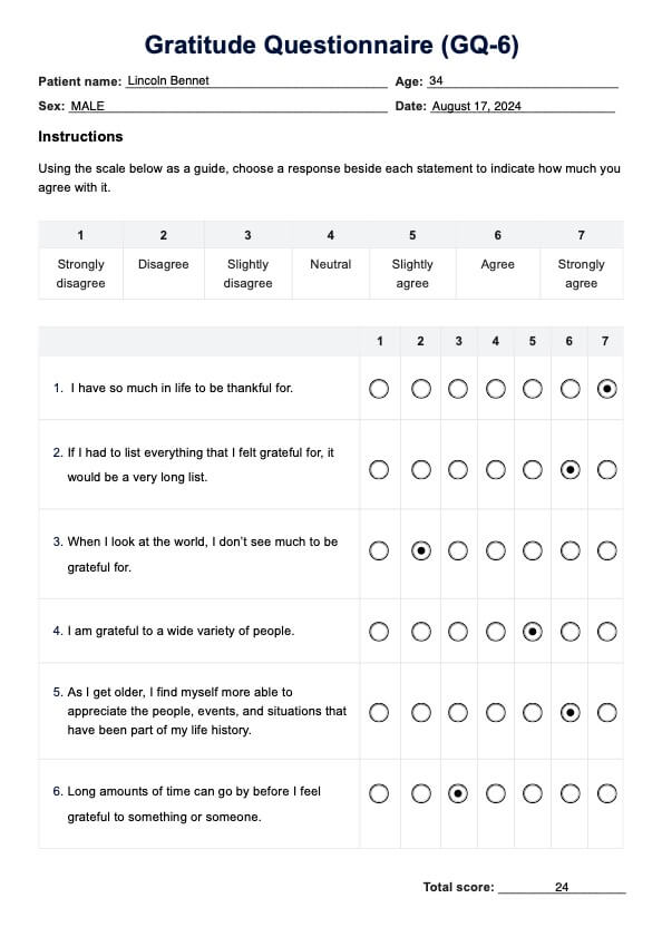 The Gratitude Questionnaire (GQ-6) is scored by summing the responses to its six items, with higher scores indicating a stronger disposition toward gratitude. Scores are then interpreted to understand the individual's level of gratitude and its potential impact on their well-being.
