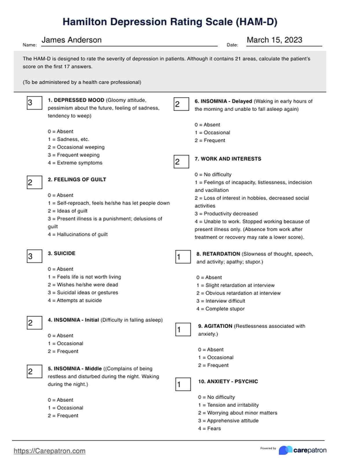 The Hamilton Depression Rating Scale (HDRS or HAM-D) is a clinician-administered tool used to assess the severity of depressive symptoms in individuals already diagnosed with depression. It evaluates mood, guilt, insomnia, anxiety, and somatic symptoms. The total score helps guide treatment planning and monitor changes over time.