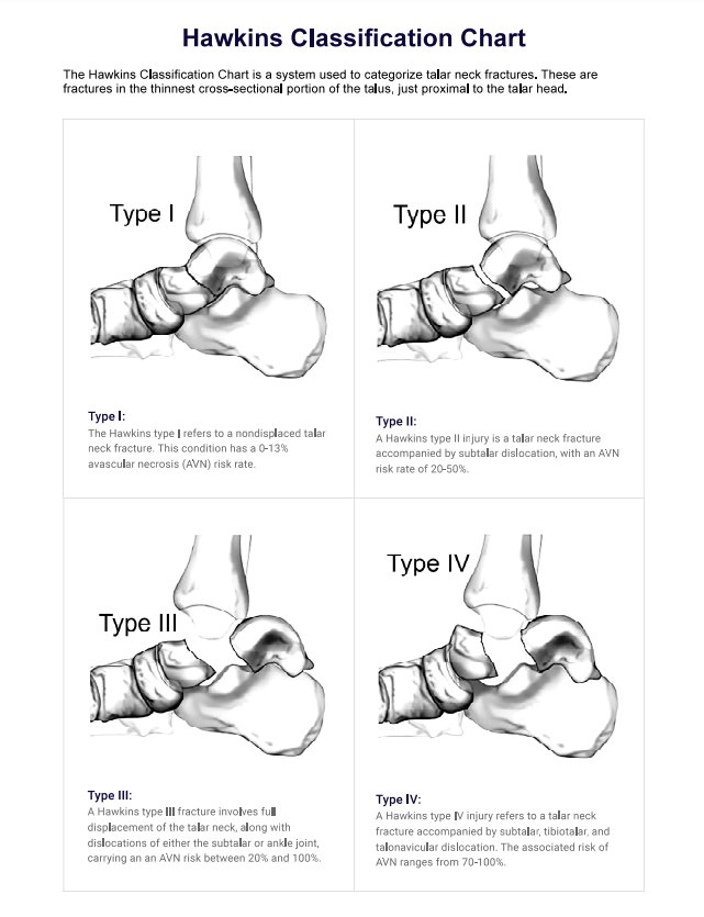 Use our free Hawkins Classification Chart template to classify talar neck fractures. Incorporate this into your physical therapy practice for free.