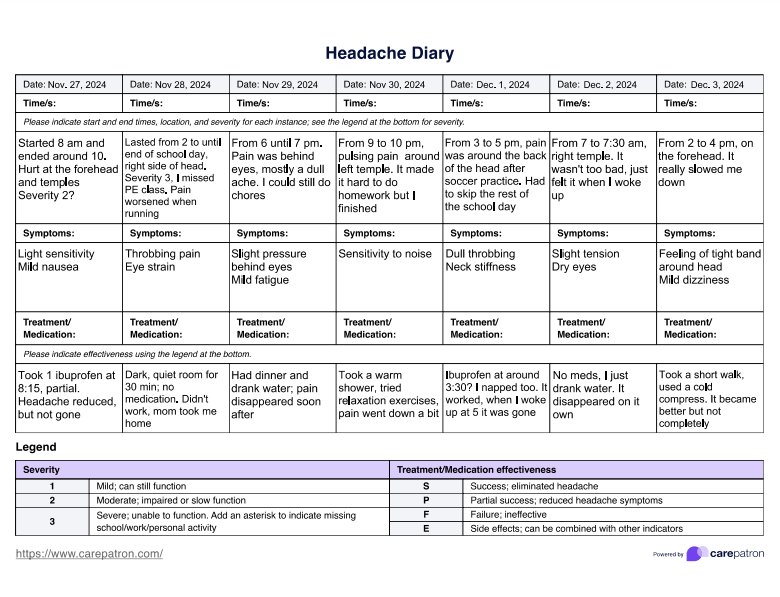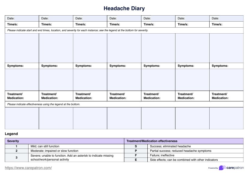 For effective headache management and treatment, try our Headache Diary template today—it's free on the Carepatron app!