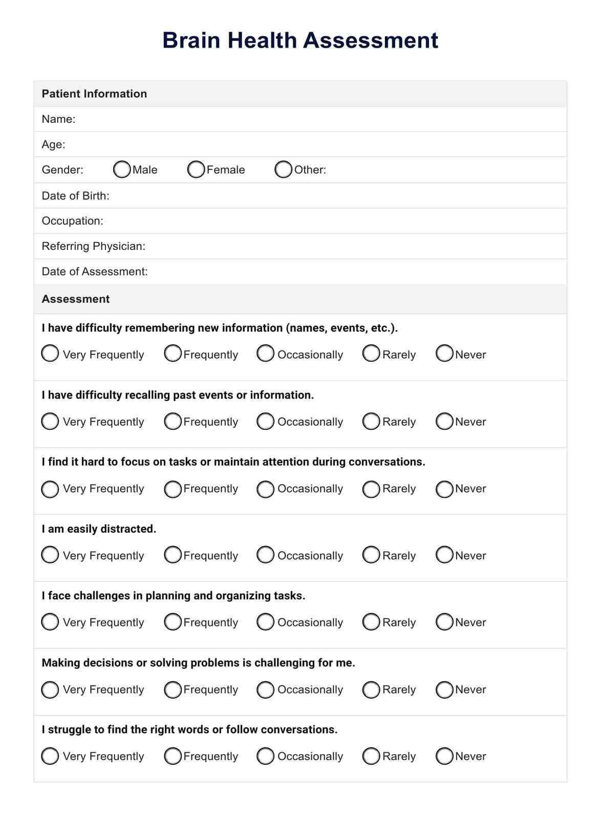 The frequency of health assessment forms will depend on the individual circumstances of your patients. In general, it may be helpful to complete a health assessment annually or as needed to track changes in health status over time.