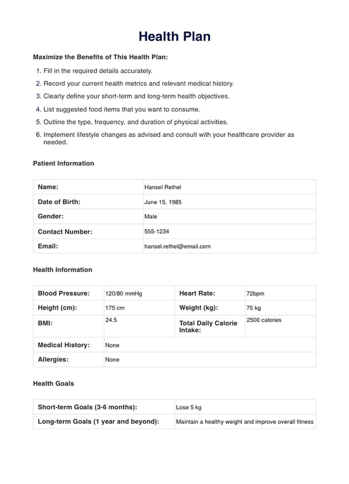 Take charge of your well-being. Crafted for your unique journey, our Health Plan Template empowers you to achieve your health goals.