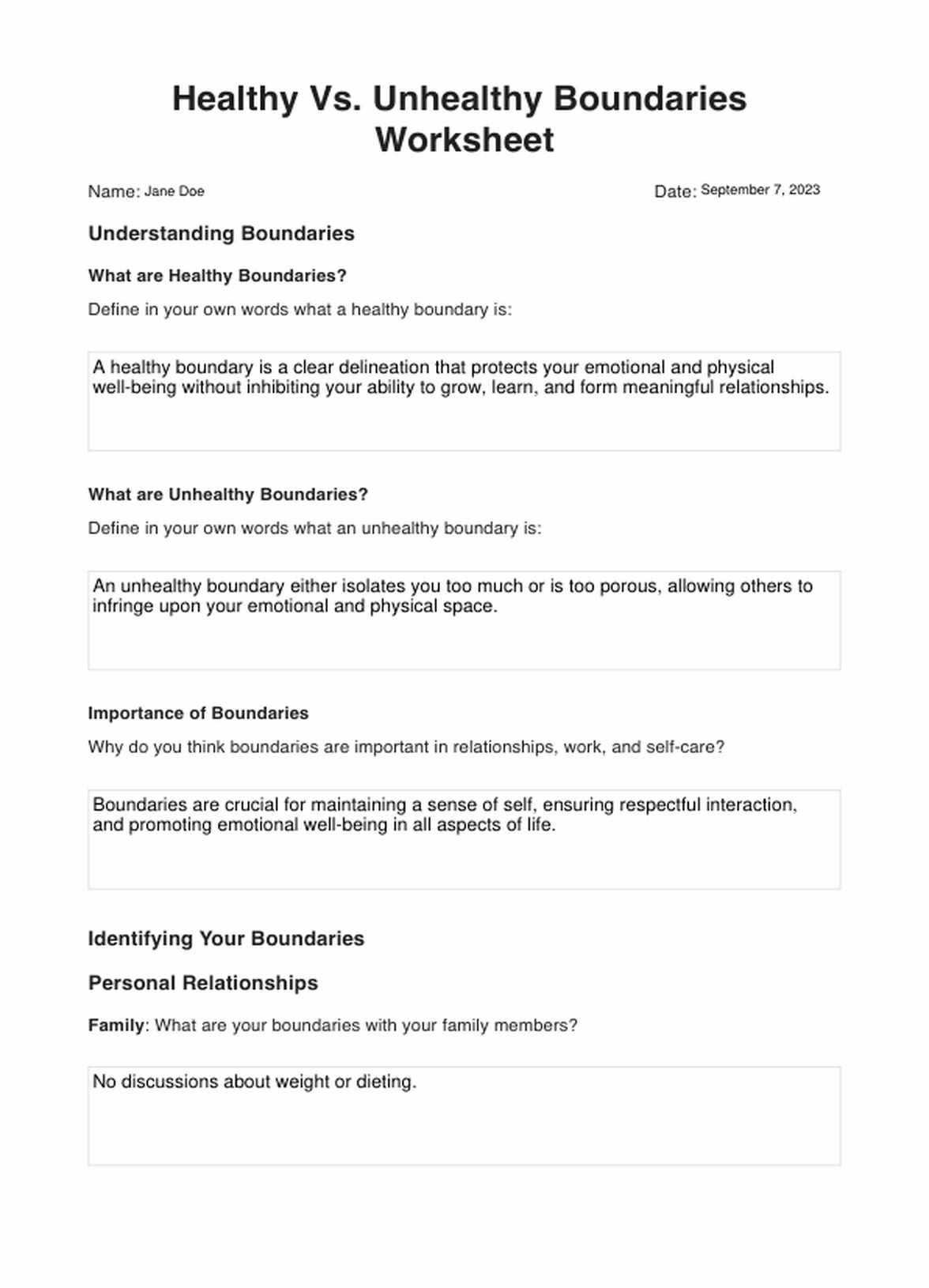 Healthy vs. Unhealthy Boundaries Worksheets Template