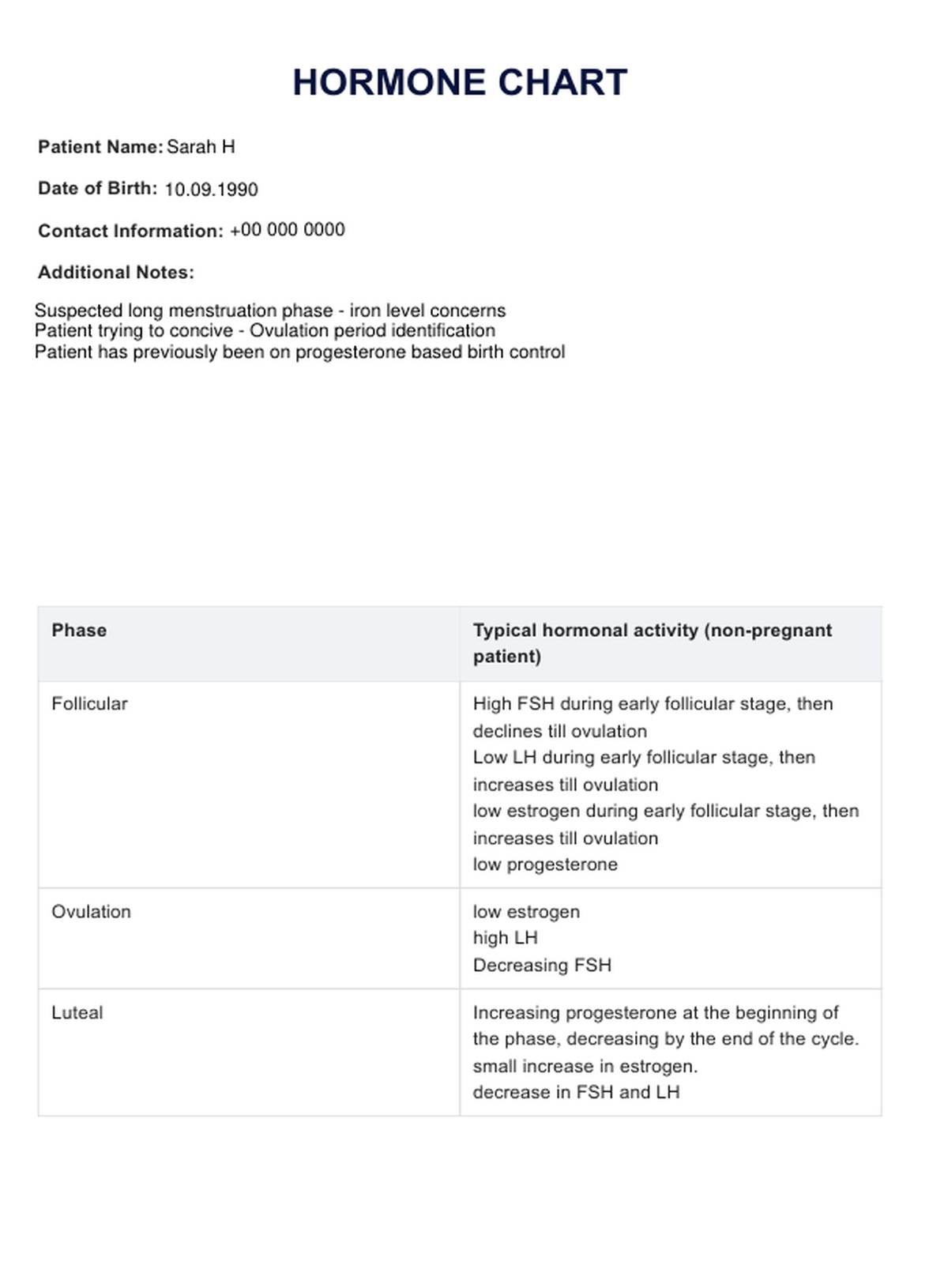 Our hormone chart template can be utilized in many ways: to support patients in beginning their menstrual tracking journey, to help identify a suspected irregular pattern, to educate patients on their hormone fluctuations, and to contribute to the wider picture of the individual's health and wellbeing.