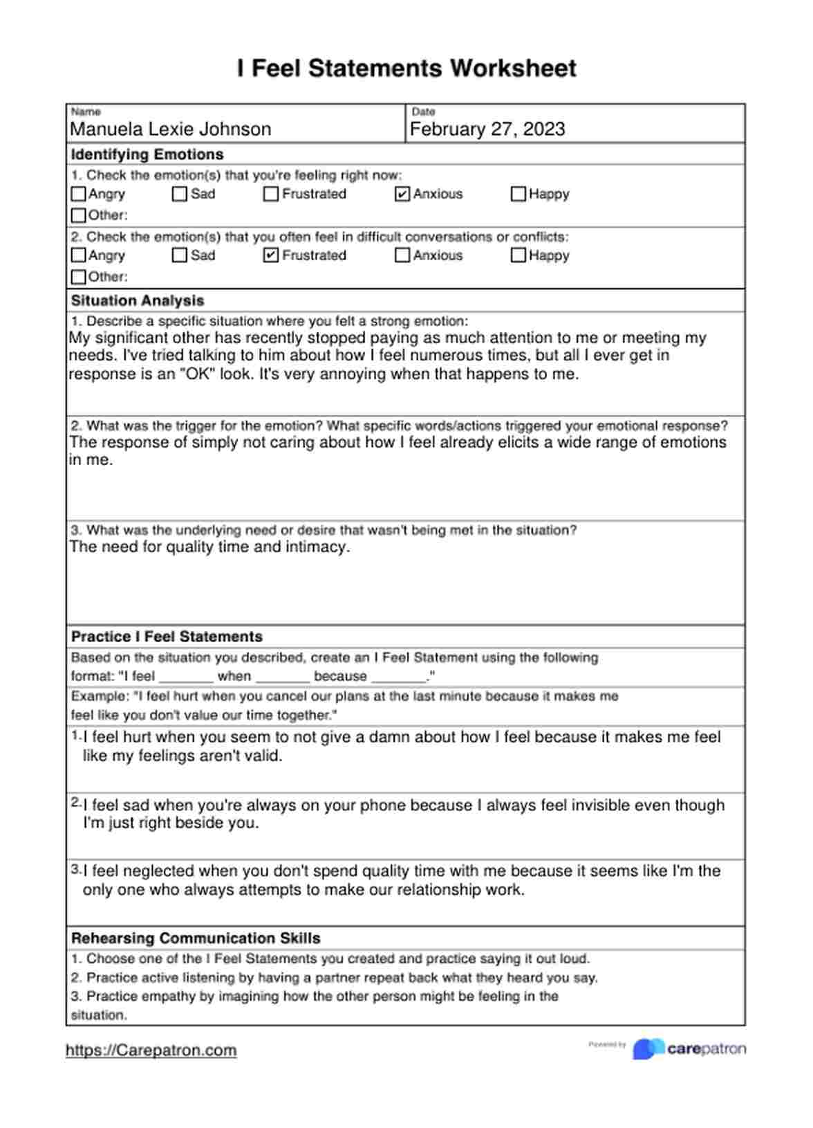 Our free I Feel Statements worksheet template can be used by anyone who wants to recognize and express their feelings in a more effective way. It is often used by mental health professionals, counselors, and therapists in a therapeutic setting to help clients talk about their feelings. But it can also be used by one person, a couple, or a group to improve communication and understanding in a personal or professional setting.