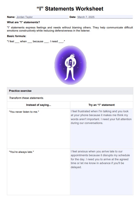 “I” Statements Worksheets are designed to help individuals express their feelings in a non-confrontational way. Using the “I” statements shifts the focus from blaming others to confronting their emotions.