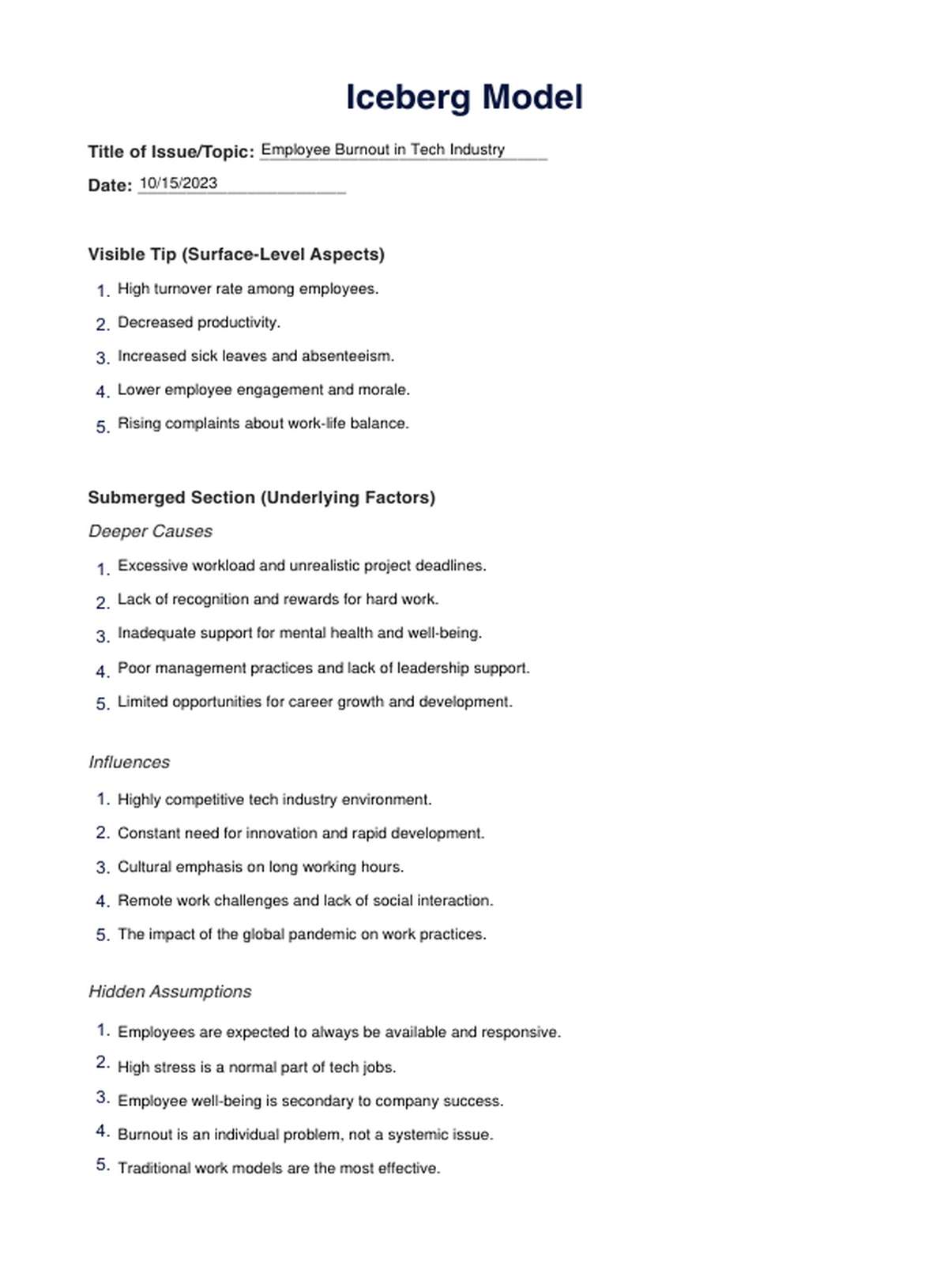 To create an Iceberg Template, divide it into two main sections: the tip and the submerged part. The smaller and visible tip represents a topic's surface-level or immediately obvious aspects. Below it, the larger submerged section illustrates deeper, underlying factors or causes that aren't immediately visible.