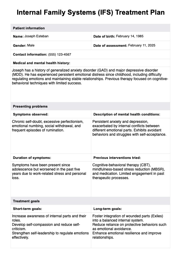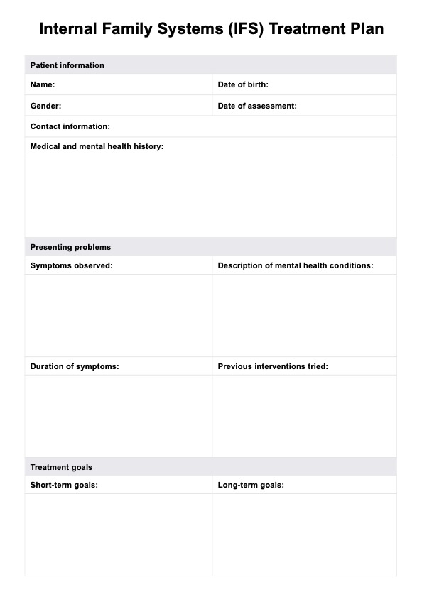 Download Carepatron's free Internal Family Systems (IFS) Treatment Plan PDF template to better understand how this therapy model is implemented in practice.