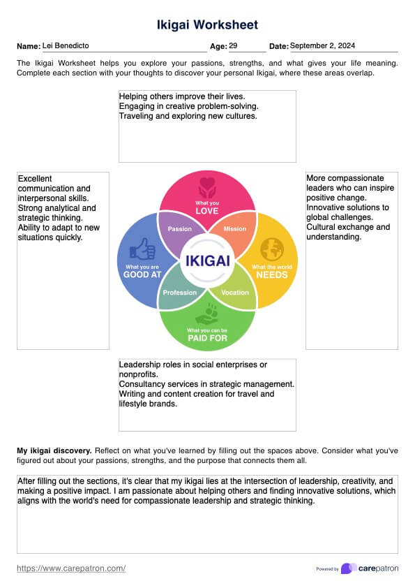 To work out your Ikigai, fill out the worksheet by listing items in each of the four circles of the Venn diagram, then look for where these areas overlap to find your true purpose.