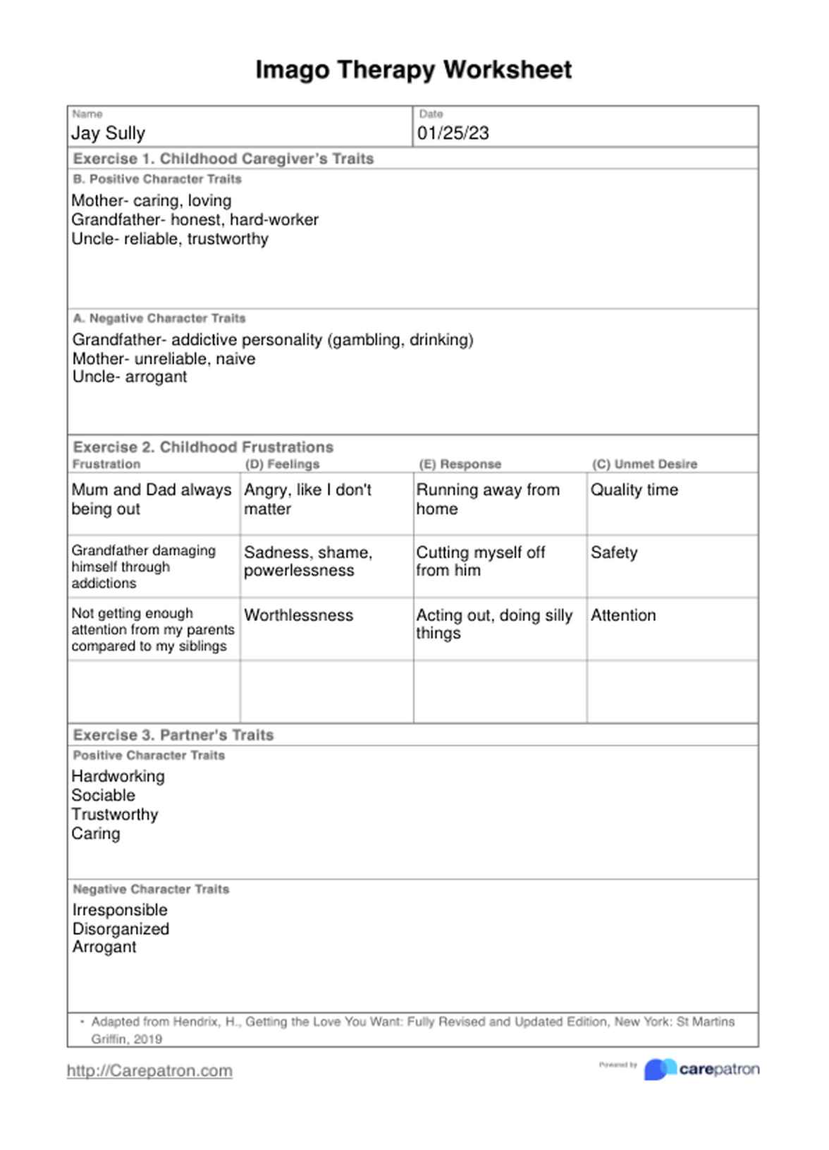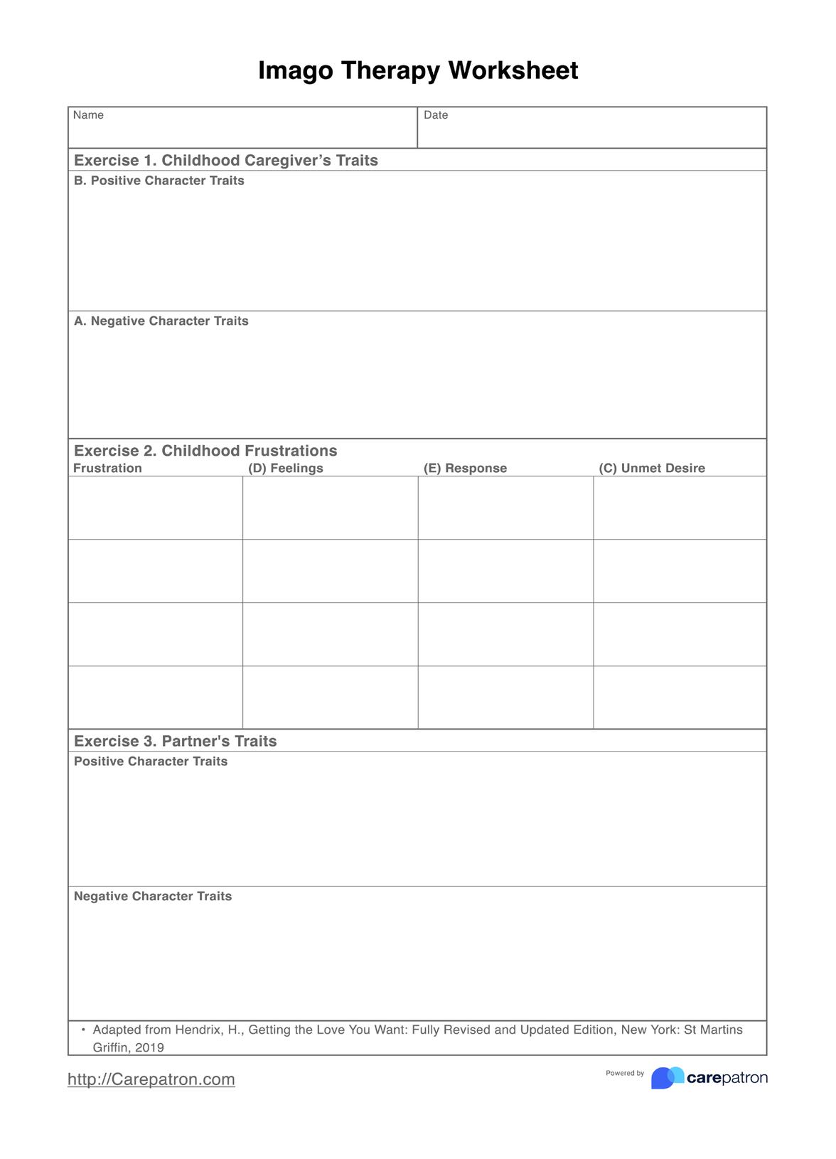 The activities in this Imago Therapy Worksheet should be completed somewhere quiet and private, and by each member of the couple independently. This will help to prevent either of them from being influenced and improve their honesty in their completion of the exercises.