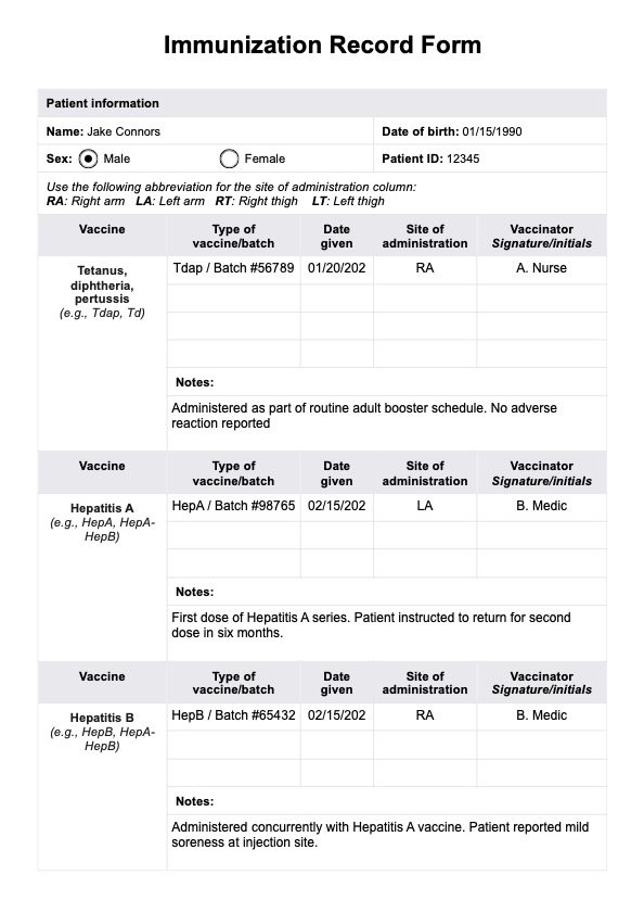 Yes, digital Immunization Record Forms provide a secure and efficient way to manage vaccination records. Platforms like Carepatron offer HIPAA-compliant storage, ensuring patient confidentiality while making records easily accessible to authorized healthcare professionals. Digital records simplify the process of verifying immunization requirements for educational, employment, or travel purposes, providing a seamless way to manage and retrieve vaccination details when needed.