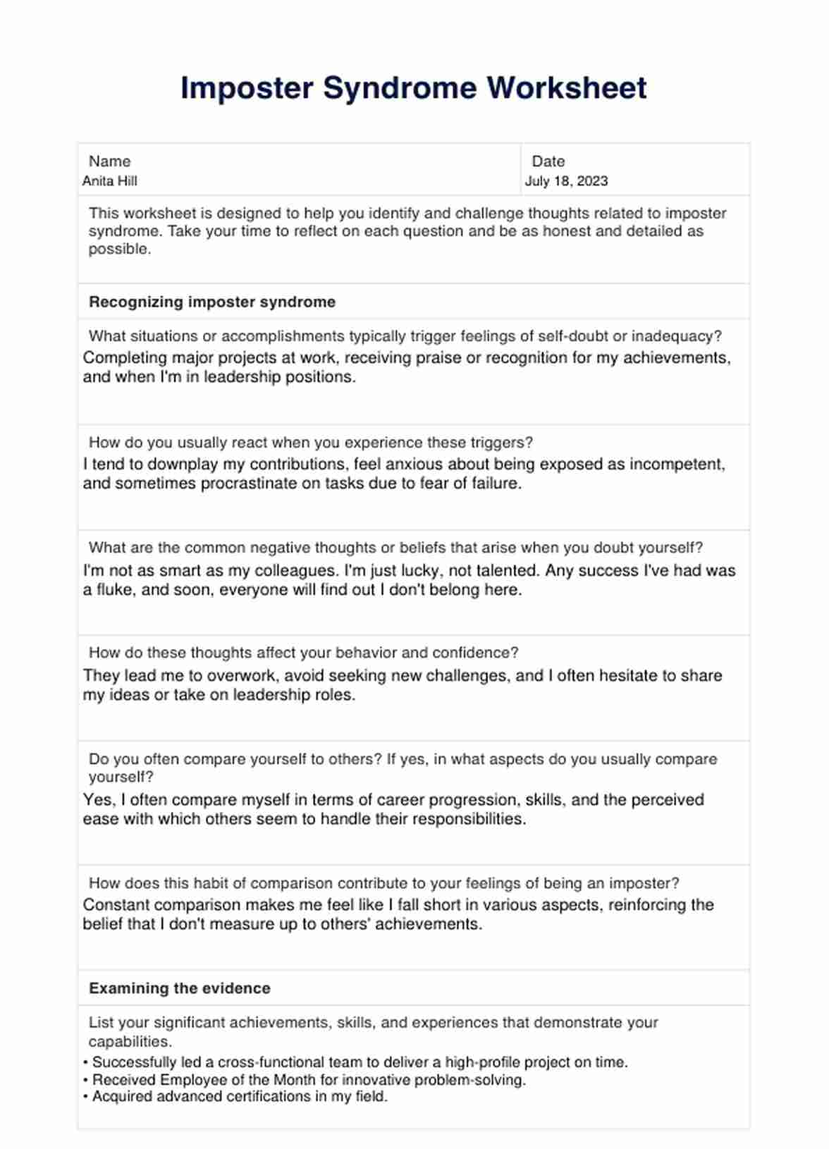 Learn how Carepatron's Imposter Syndrome Worksheet PDF can help your clients overcome negative thinking. Download the free template here.