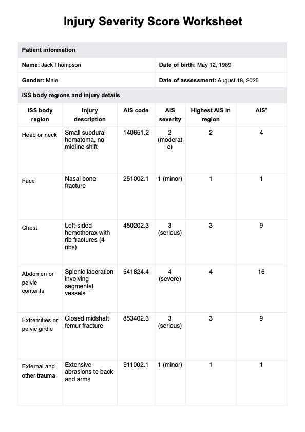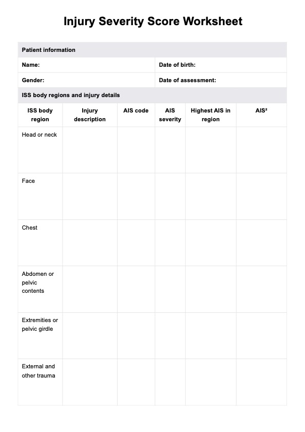 Explore the use of the Injury Severity Score (ISS) Worksheet for assessing trauma severity in patients. Access the free PDF now.